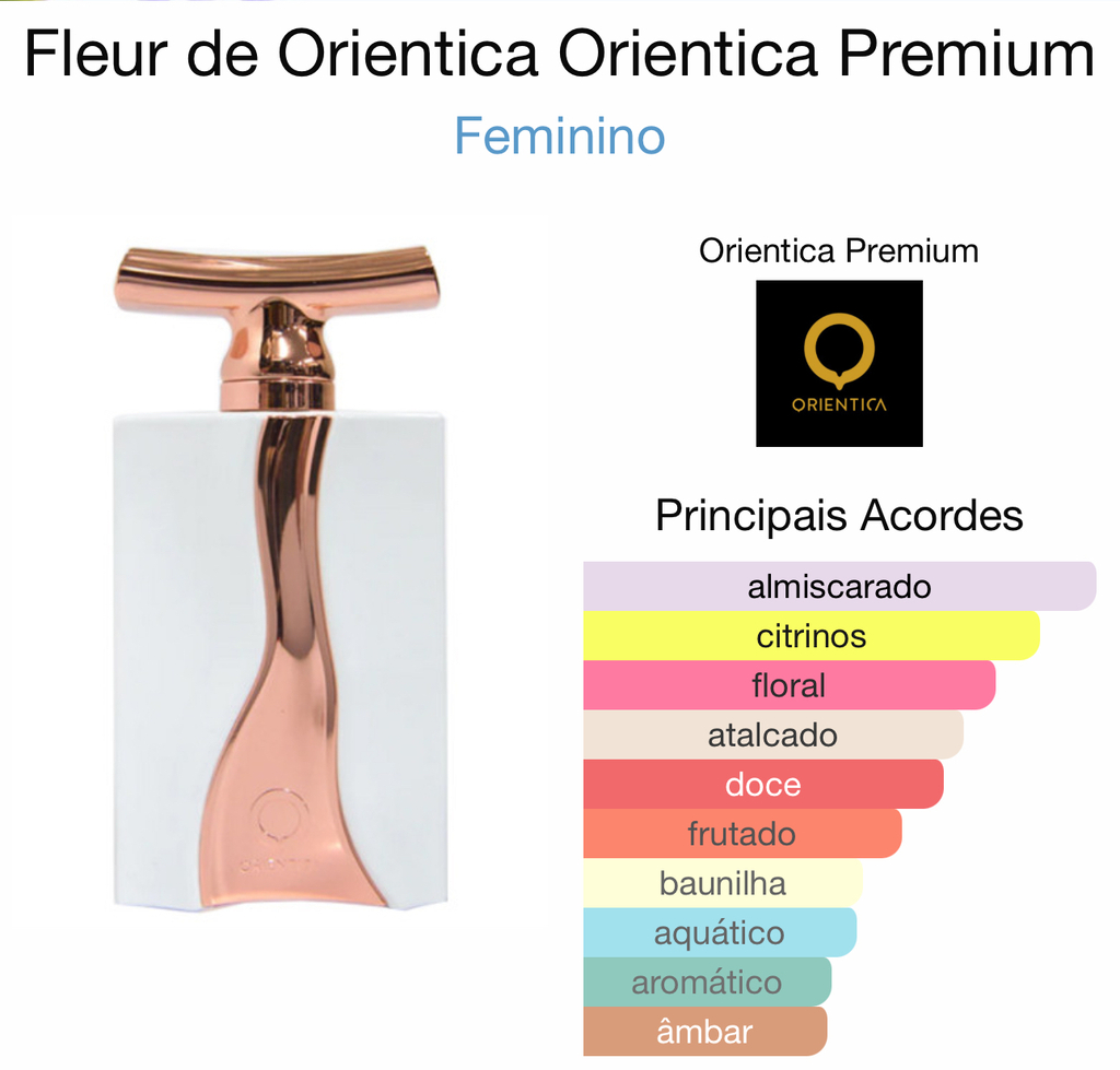 Fleur de Orientica de Orientica é um perfume Feminino. Esta é uma nova fragrância. Fleur de Orientica foi lançada em 2022. As notas de topo são: Tangerina, Flores Aquáticas e Bergamota. As notas de coração são: Chá de Frutas e Pêssego Branco. As notas de fundo são: Almíscar, Fava Tonka e Rosa Branca.