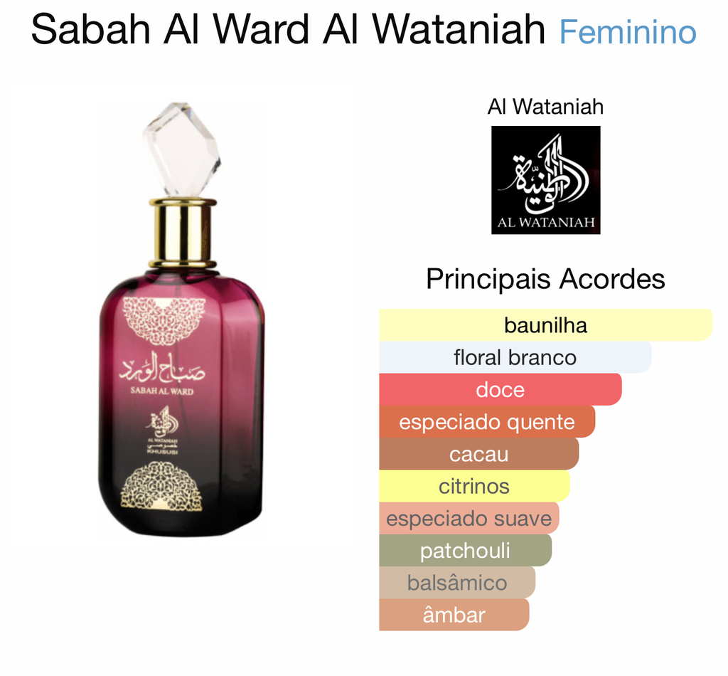 Originário dos Emirados Árabes Unidos, o Sabah Al Ward faz parte da distinta linha Dubai da Al Wataniah, que combina a sofisticação das notas francesas com a riqueza das essências orientais. Este perfume é ideal para mulheres profundas e enigmáticas, que desejam deixar sua marca com elegância.